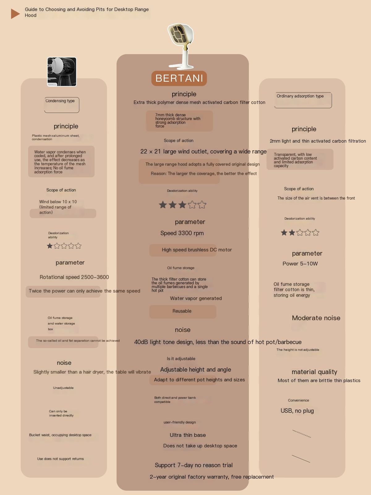 I was torn between these two models for a long time. After all, the Bettany brand was a bit expensive. But I bought them all after seeing that I could try them out. It was just a good time to compare and give some reference to my family.I tried grilling meat and compared the suction power of the two models: Bettany’s one only has one level, and the other brand’s one has 3 adjustable levels, but the suction power of level 3 is not as great as Bettany’s [laughing through tears], you can see it in the video Comparing it, we can see that Bettany sucked more fully, while the other one leaked a lot.Overall, I still think this one is easy to use, the height can be adjusted, and the filter is thicker and denser.200 yuan is enough to save money on a barbecue meal outside, so it doesn’t feel expensive anymore.I don’t plan to return the cheaper one, and I’m too embarrassed to return it to the merchant because of the fumes after use. I plan to give it to my brother for home use.Recommended for family members who like barbecue and hot pot.