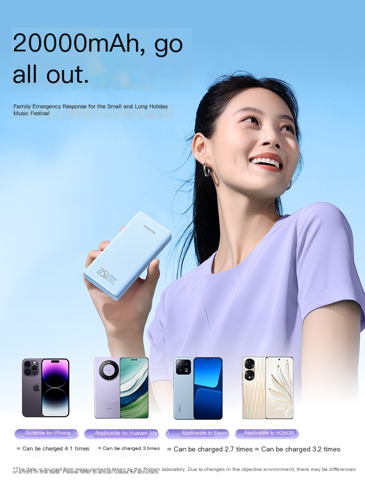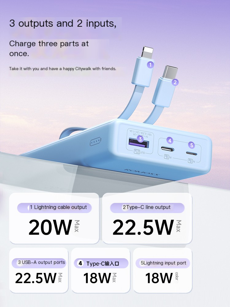 The ROMOS power bank uses high capacity batteries and has a large capacity of 20000 milliampere hours. It supports dual built-in cables, making it convenient for users to use, and supports 22.5W ultra fast charging technology, which can quickly charge devices such as phones and tablets. Small and cute portable design, suitable for outdoor use, suitable for various mobile and tablet devices. In addition, it also has a universal flash charging function, which can meet the needs of different devices. This power bank is suitable for outdoor mobile power supply and provides a convenient power solution for outdoor activities. The above content is for reference only. It is recommended to write a more convincing copy based on the actual usage experience of the power bank.