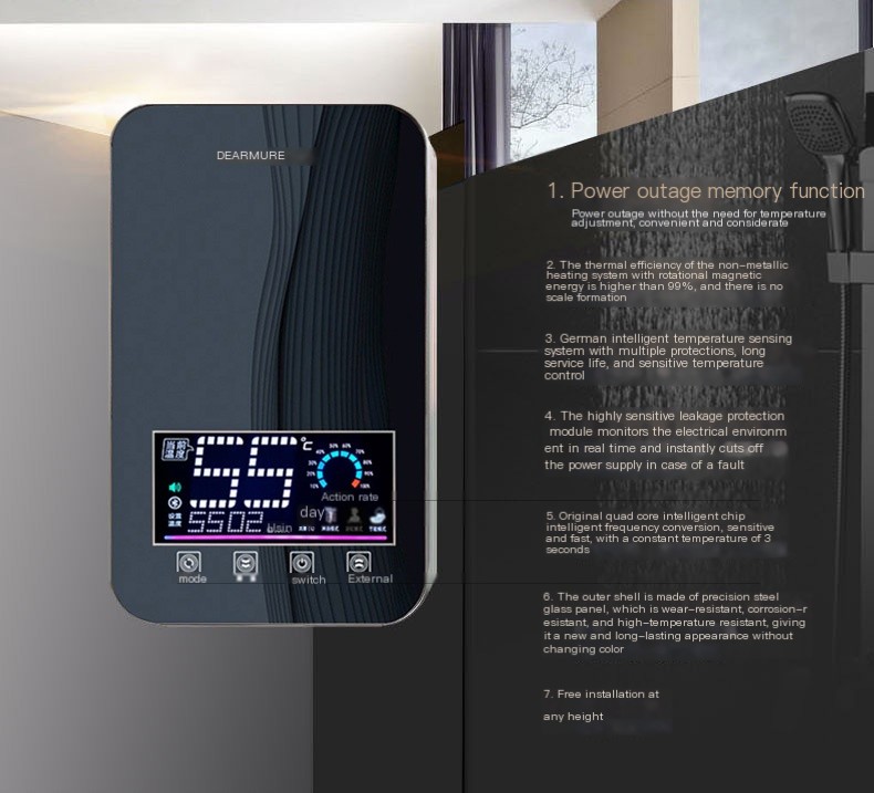 No need to store water in advance, you can enjoy hot water anytime, saving water storage space and waiting time. In addition, the compact design of this water heater makes it suitable for various home environments, whether it is new house decoration or old house renovation, it can be easily installed. Its outstanding performance and beautiful design make it a shining pearl in the market, making it the ideal choice for your home shower.