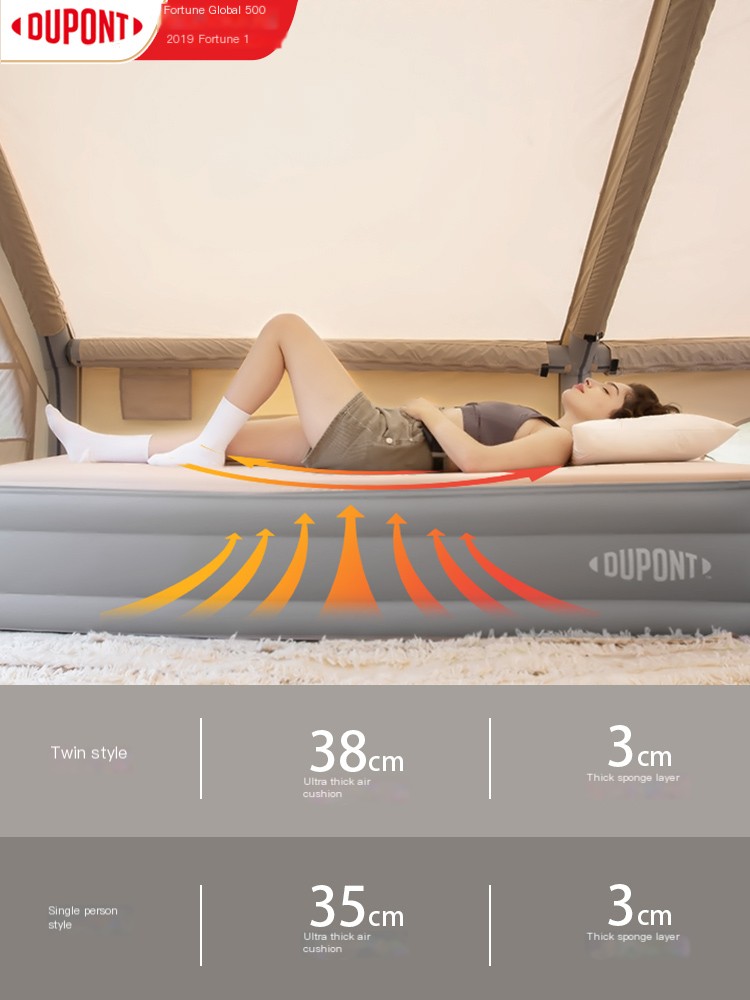 This outdoor camping portable inflatable mattress is manufactured by DuPont and is a high-quality sleep solution. Well designed, easy to carry, suitable for home, outdoor camping, and use on sofa beds. It has good comfort and support, providing stable support whether on grass, beach, or flat ground. This mattress adopts an inflatable design, which is easy to inflate and can be completed in just a few minutes. After inflation, the mattress will expand and fit the curves of the body, providing unparalleled comfort. In addition, the mattress also has the characteristics of moisture and wear resistance, protecting your sleeping environment from external interference. For family or friend gatherings, this mattress can easily fold into a double mattress for easy use. Its size is flexible and can be adjusted as needed. Meanwhile, it is also a portable product that is convenient to carry and store. Overall, DuPont Cloud Bed Inflatable Mattress is a high-quality, multifunctional, and easy-to-use choice for outdoor camping and home mattresses. Whether for camping enthusiasts or daily household use, it can bring you a comfortable and reassuring sleep experience.