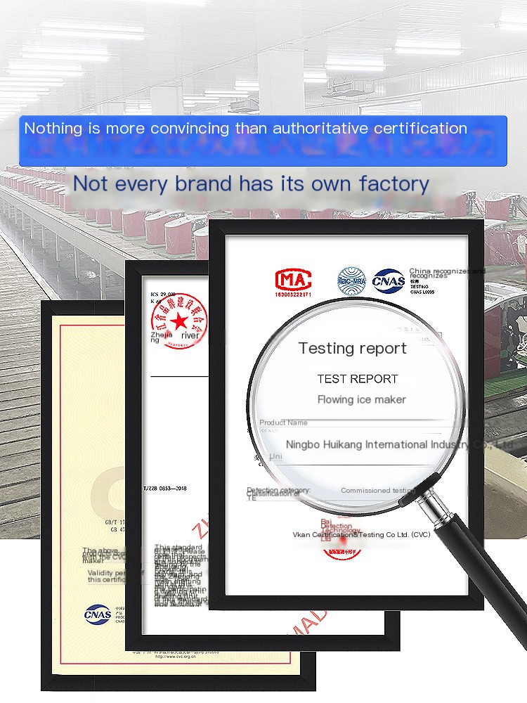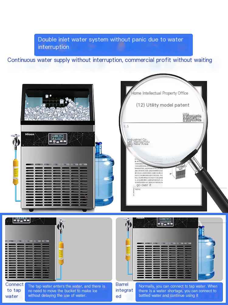 Silent effect: low water flow sound during the ice making process. Power efficiency: good power, producing about 100 kilograms per day. Ice making effect: fast ice making speed, good ice quality!