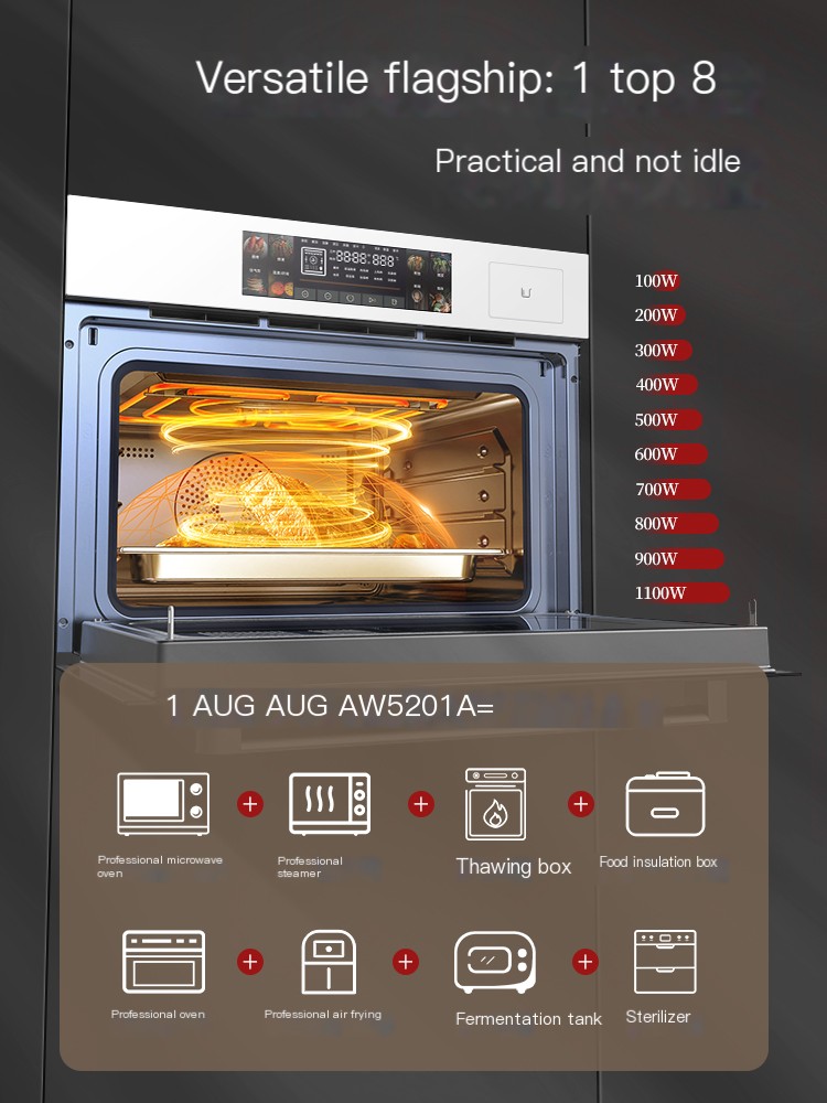 AUG embedded microwave oven is a powerful kitchen device that integrates microwave oven, steaming, baking and other cooking functions. This device adopts black and white tones, simple and elegant, and easy to integrate into various kitchen environments.